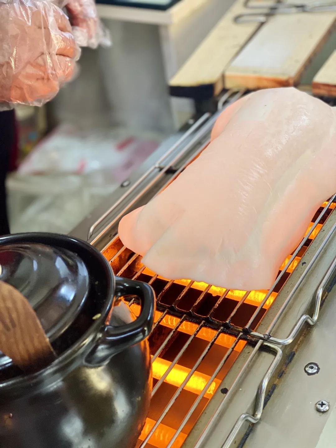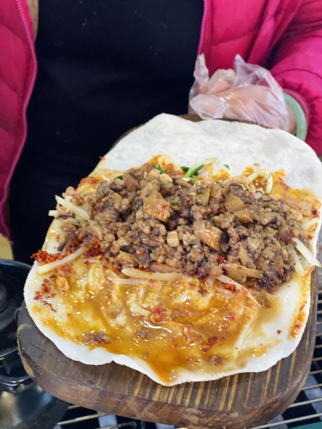 我們首先點(diǎn)了一個(gè)生態(tài)土豬肉餌塊。這家餌塊的料,真的讓我驚呆了。餌塊烤好了,嬢嬢往上面堆了一層又一層的醬料、肉沫。原諒我,用了“堆”字,因?yàn)閷?shí)在是太實(shí)誠了!我都擔(dān)心卷不上了。