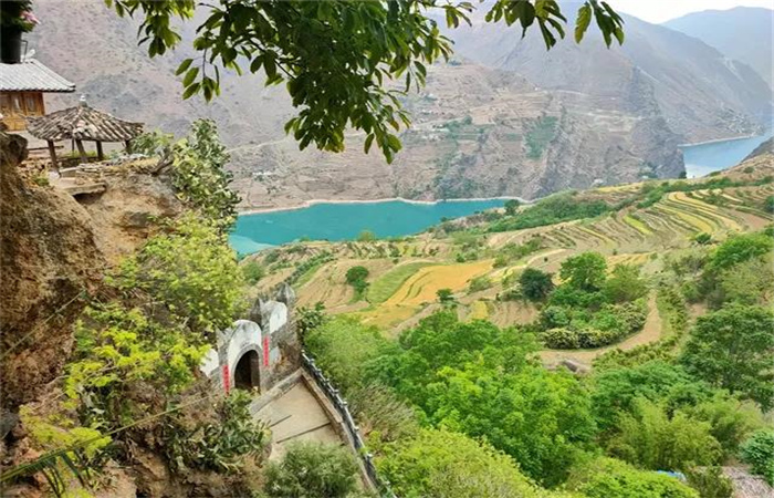行過幾道彎,就看到石頭城聳立于江邊峽谷的陡峭山坡上,三面皆是懸崖絕壁,一面石坡直插金沙江。