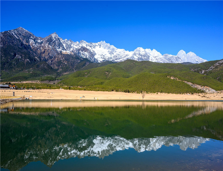 站在玉湖湖畔,連綿不絕的雪山倒映在湖面上,宛若一巨幅畫(huà)卷,令人心曠神怡,如此美景,人間少有。