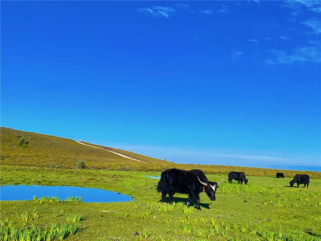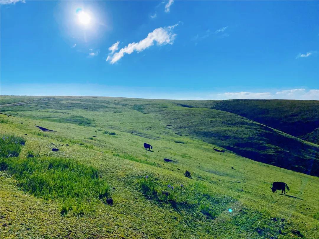 雖是陽光明媚的夏日,卻有些許涼意。3700余米的海拔,賦予了格拉丹得天獨(dú)厚的高原氣候。片片連綿起伏的山丘與天相接,浩瀚無垠,似乎是被精心修飾過一番,讓人不覺驚嘆大自然的鬼斧神工。