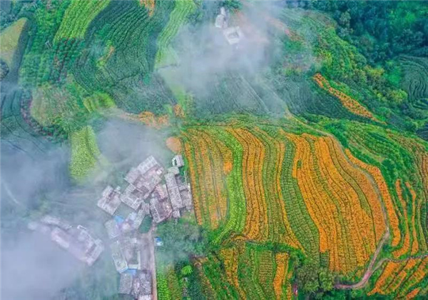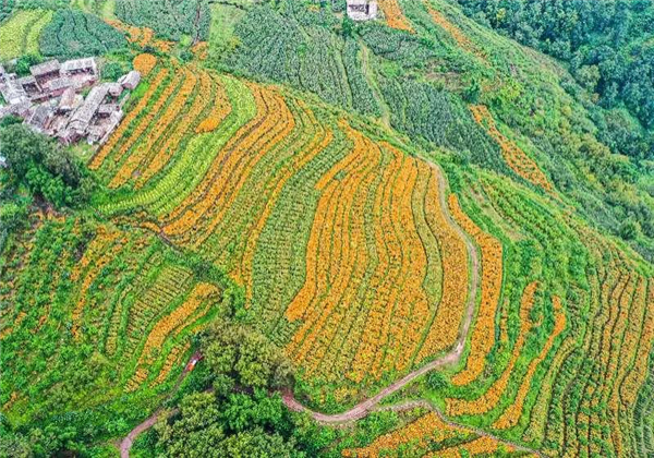 走進(jìn)維新村的田間地頭到處都是漫山遍野的橘黃色花簇錯(cuò)落有致,連綿起伏成了鄉(xiāng)村田野上一道靚麗的風(fēng)景線。