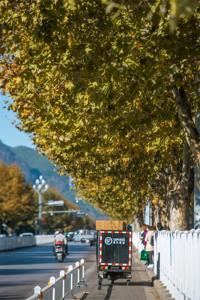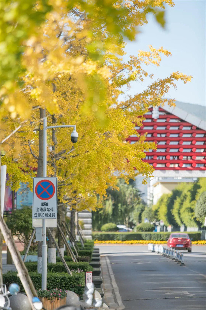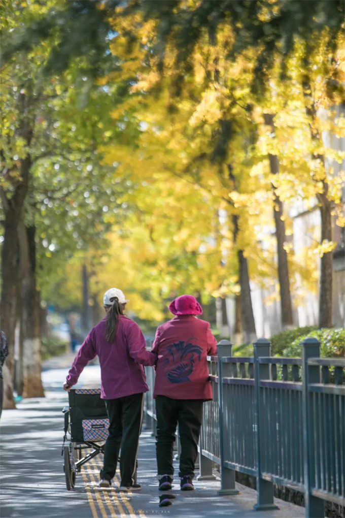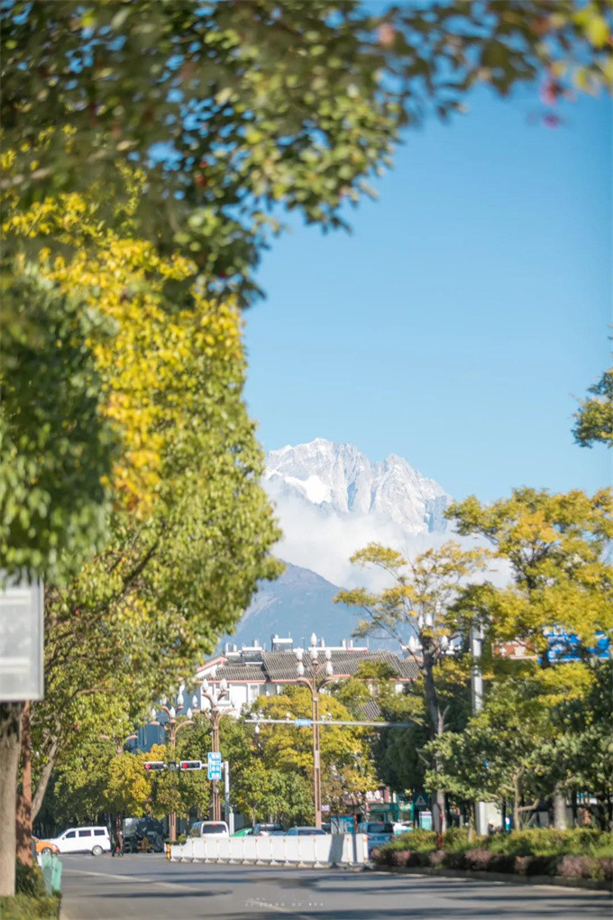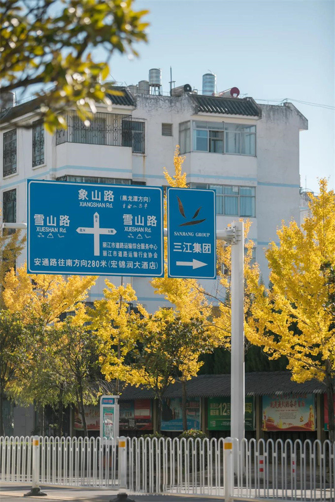 要說銀杏為何討人歡心,藍天一定脫不了干系。麗江秋冬的天空澄澈得連一片云都沒有,從象山西路一路往東,再朝著雪山路南下,沿著銀杏樹的足跡,看老人相伴而行,看朋友嬉笑而過,也可以回頭看看雪山和秋色依偎。