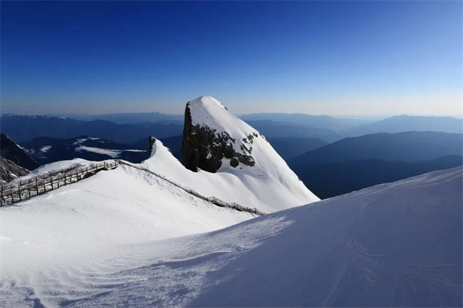 雪是冬天的靈魂,在碧藍天幕的映襯下,玉龍雪山像一條銀色的矯健玉龍橫臥在山巔,秀麗挺拔。冰雪之上,晴空之下,游人行走棧道,人間仙境不過如此。