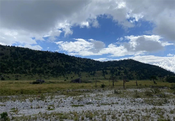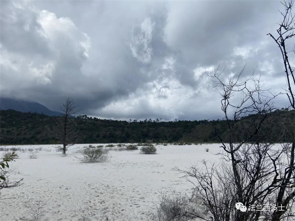 嗯,是干河壩了,雪山冰川沖擊成的河谷,由于前一晚下過雨,這些白白的碳酸鈣成分的東西其實腳踩很可能陷進去,莫名有一種沼澤的感覺,我的鞋子就在這里整個踏進去了,陷進去大概20厘米,好不容易才脫身。在這里,就是小紅書里關于干河壩95%的取景地了,加上個濾鏡,很仙很寂靜。跟著軌跡是在干河壩右邊爬坡離開,一個小爬坡,到山頂可以俯瞰遠方。但是后面的下坡就比較艱難了,畢竟積聚了4,5小時的疲憊。但是路是不難走的,我們好像1小時不到就走到了馬路,過了馬路,就是前文提到的甲子頂峰餐廳,在走之前,我擔心打不到車,叫了順風車,結果滴滴上是有合適的路線,但是沒人接單,不我在問了下旅行社的車,問有沒多空位拼車回麗江,他讓我們直接打車,嚯,還以為不能打。結果50元出頭,就直接送我們回了古城。至此徒步結束。關于出行。這次只帶了點路上吃的干糧,當天不曬(甚至是陰天,所以玉龍雪山基本沒蹤影),所以沒喝很多水,但是防曬還是不能省的,不建議穿短褲,10月份去的話,帶件薄外套就夠了,沒有專業(yè)裝備。這條線路目前還是很小眾的,即使在國慶,人都不多,在干河壩處,我們只見到兩伙游客,其他的都是本地人,但不知道為什么他們要走進山里,這個地方小眾到有些本地人都不知道,就知道璞修和石洛克這兩個酒店在開發(fā)這條線作為一個旅行體驗。另外就是我前文提到的ota上這條線360元,往返的車+領隊+零食,感覺自己賺大發(fā)了。順帶,查資料時還種草了一個叫螞蟥壩的地方,也是在玉湖村附近,看圖片也蠻好看的,下次再出發(fā)~