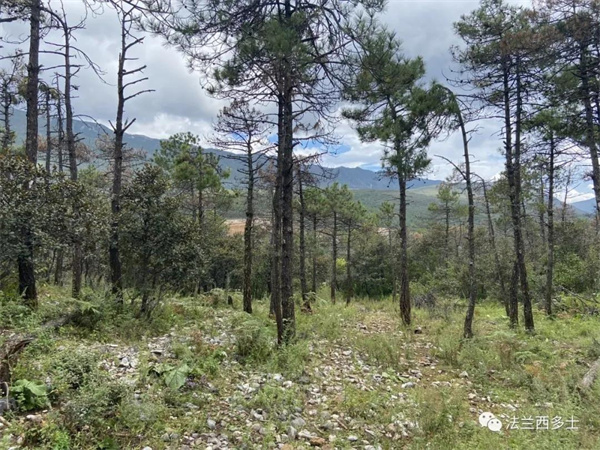 天氣陰沉沉的,龍女湖也不好看,雪山更是了無蹤影——果然,陰天是旅行出片的敵人,這一切都讓我們興致有點低,但還是如此開始了打開導航。在路上先映入眼簾的,是非常緩慢的上坡,一路上的上坡,基本上沒有看到路,如果沒有軌跡,的確會讓人找不到路,進入森林里,路逐漸明朗了起來,時不時有分岔路,但是兩邊都是可以匯合在一起的,由于前一晚下了雨,當天的露水非常多,慶幸自己沒有穿短褲。
