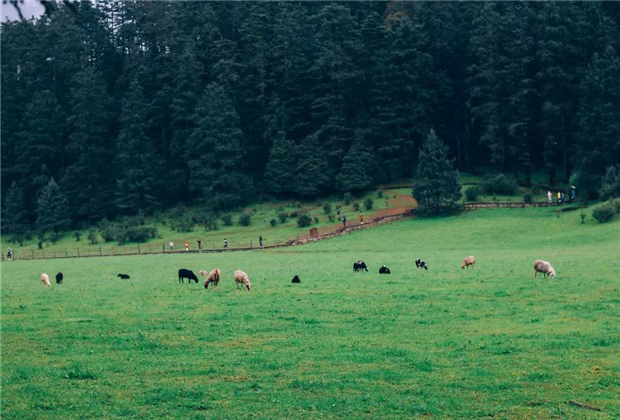 墨綠色的山林就就像幾面翡翠的屏風,翠綠翠綠地豎在你面前,包裹著一望無際的大草地,牛羊低頭吃著草,你會覺得這里的空氣就突然有了一種跟綠有關的味道,溪水從腳邊流淌而下,山的綠影靜靜地沉在水底,仿佛那潺潺的流水聲都帶上了那么一些清涼而爽朗的綠意。