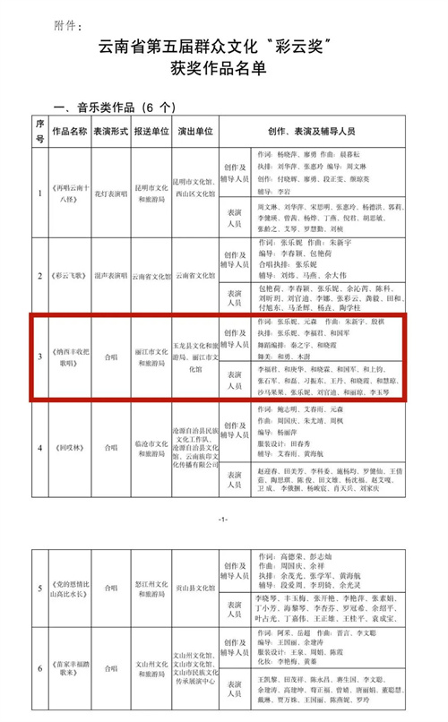 近日? 云南省文化和旅游廳公示了? 云南省第五屆群眾文化“彩云獎(jiǎng)”? 獲獎(jiǎng)作品名單? 麗江市有2個(gè)作品擬獲獎(jiǎng)省文根據(jù)《云南省第五屆群眾文化“彩云獎(jiǎng)”評(píng)獎(jiǎng)辦法》,省文化和旅游廳組織開(kāi)展了云南省第五屆群眾文化“彩云獎(jiǎng)”評(píng)獎(jiǎng)工作。經(jīng)專(zhuān)家評(píng)委評(píng)審并報(bào)送云南省第五屆群眾文化“彩云獎(jiǎng)”活動(dòng)組委會(huì)審議,形成了云南省第五屆群眾文化“彩云獎(jiǎng)”獲獎(jiǎng)作品名單。