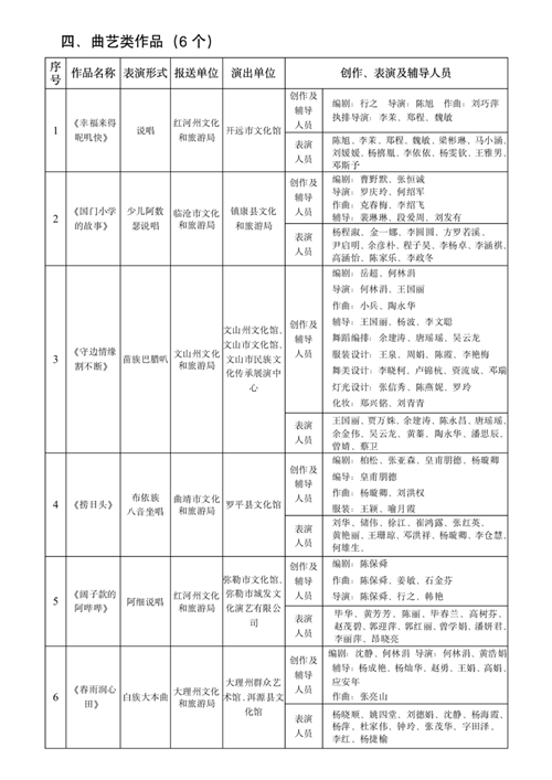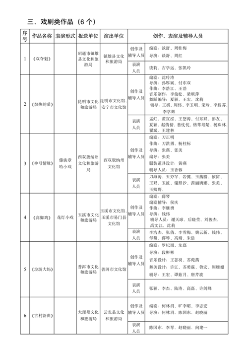現(xiàn)將云南省第五屆群眾文化“彩云獎(jiǎng)”獲獎(jiǎng)作品名單予以公示,公示期自即日起7個(gè)工作日(11月8日—11月16日)。如有異議,請(qǐng)?jiān)诠酒趦?nèi),以書(shū)面方式實(shí)名反映,并提供異議理由和有關(guān)依據(jù)、證據(jù),以及反映人姓名、工作單位(或反映機(jī)構(gòu)名稱(chēng))、聯(lián)系方式。