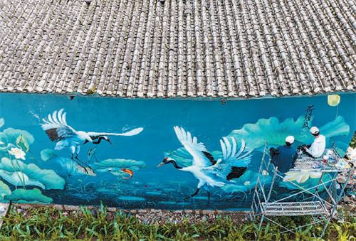 “鄉(xiāng)村也需要色彩、需要藝術,以前就是沒有太多人去做嘗試?!眲⒅菊\說,“家鄉(xiāng)的每一面墻,可能都是我小時候爬樹、捉魚路過的地方。想到能在這里畫畫,我就充滿動力?!?br /> 回村的第一幅畫,劉志誠選在自家老宅的院墻。墻皮脫落嚴重,他索性創(chuàng)作了一個正在繪制墻繪的孩子,半面墻繪成為他用夢想改變村莊的開始。