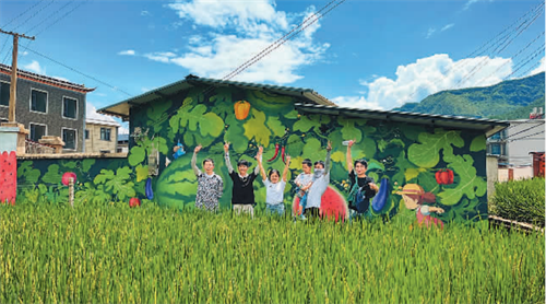 劉志誠(左二)與村民在墻繪前合影。受訪者供圖