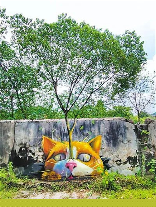 “創(chuàng)作不比臨摹,要讓墻繪跟周圍環(huán)境融合?!贝謇锏睦先藢Α靶茇垺鼻橛歇氱姡瑒⒅菊\就畫了幾幅。其中一幅,墻前的一棵小樹正好擋住畫,村民看完就準備砍樹。劉小備趕緊拉住,在樹后畫了一棵更大的樹,使現(xiàn)實的樹自然融入了墻繪。