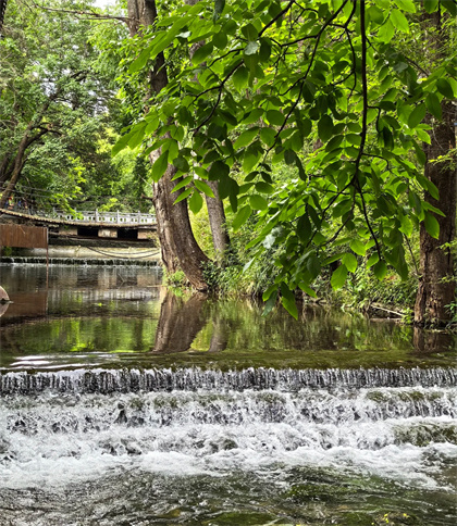九鼎龍?zhí)兜乃鲎札埲缴侥_的石頭縫隙里,潭水不深,但卻夏季不渾,冬季不淺,一股清澈的流水從石隙中溢出,永遠(yuǎn)滋潤(rùn)著古鎮(zhèn)。潭周綠柳垂地,翠柏指天,泉水清澈,潭中游魚(yú)甚多,被當(dāng)?shù)厝朔顬樯耵~(yú)。民間傳說(shuō),凡是偷吃龍?zhí)渡耵~(yú)者,都會(huì)遭災(zāi)禍。由此,神魚(yú)得到保護(hù),自我繁衍,悠閑地在泉水中生息。