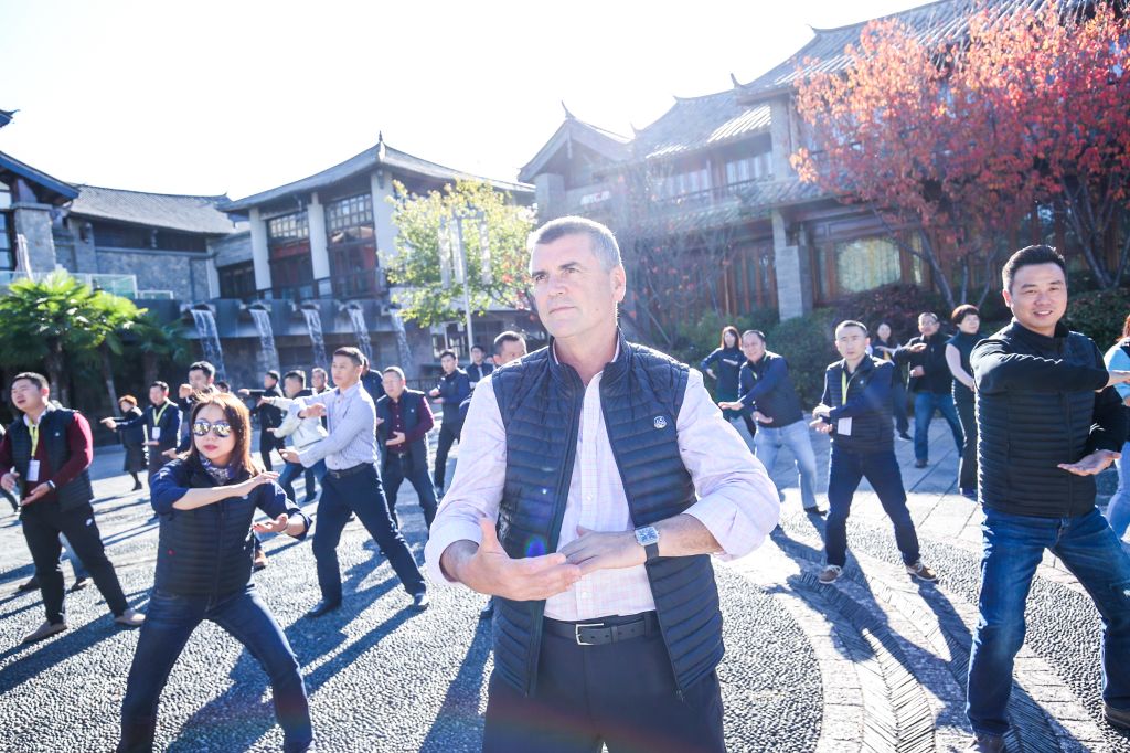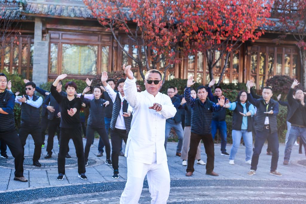 WD-40員工與經(jīng)銷(xiāo)商們?cè)谌赵鹿鈴V場(chǎng)進(jìn)行悠閑的有氧運(yùn)動(dòng)——太極操,放松身心,舒展筋骨。