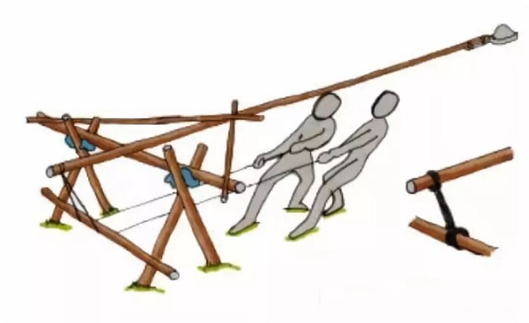 3、 拉動連接竹竿的長繩,炮架才能發(fā)射,竹竿通過杠桿原理彈射出炮彈。