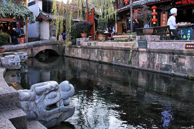 麗江古城是一座沒有城墻的古城,古城倚玉龍雪山雪水、黑龍?zhí)朵迦?,依山傍?shì),環(huán)繞古城的三大水系從玉龍橋穿街過巷,入院穿墻,流布全城,形成“家家流水戶戶垂楊”的江南景色,既有山城之容,又有水城之貌。