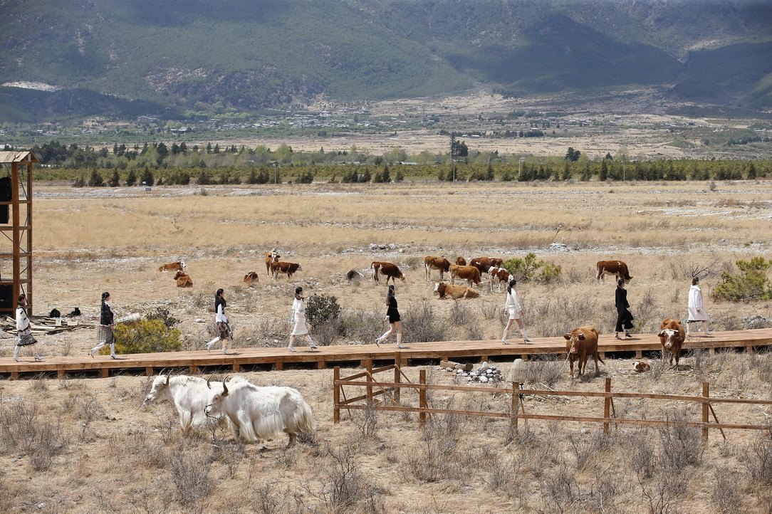 發(fā)布會(huì)秀場真實(shí)還原了當(dāng)?shù)赜文磷迦旱纳顚?shí)景,以雪山為背景,取自然之大成,木堆、瞭望塔、草垛、柵欄、牛羊等元素裝飾凌空而起,將靈性自然的意境躍然眼前,以最直觀的方式將原生態(tài)韻味展現(xiàn)給現(xiàn)場觀秀嘉賓。