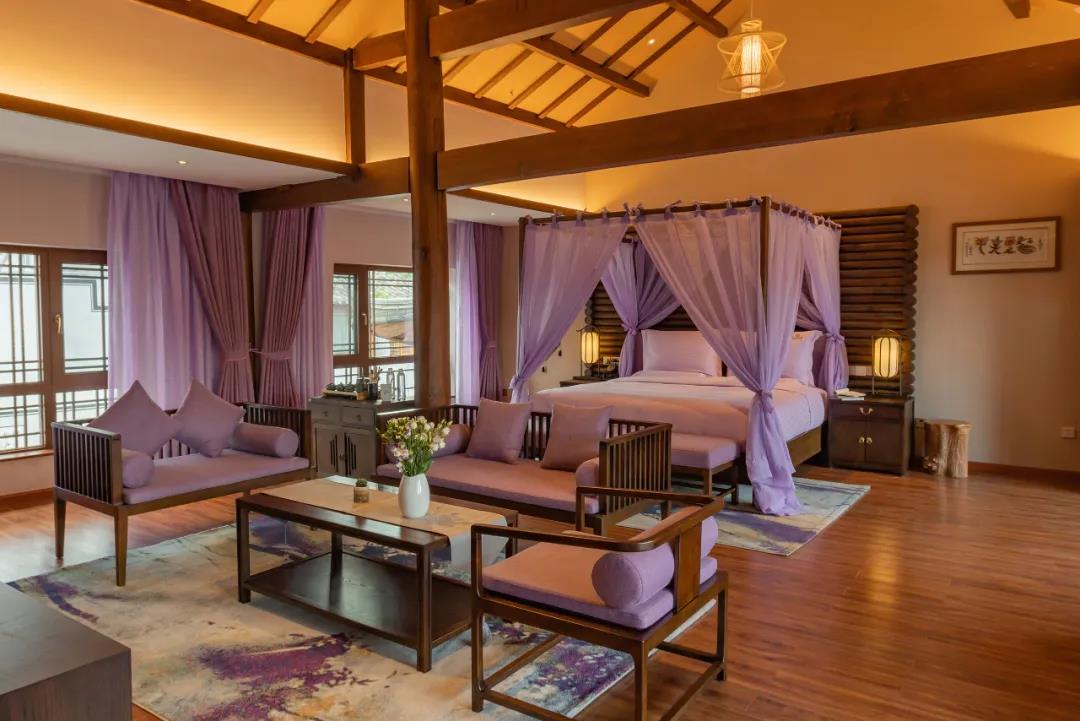 瀘沽湖這間主臥面積近90平,置身于房間中就可以感受瀘沽湖畔的摩梭風(fēng)情,還可在獨(dú)立陽臺上坐在沙發(fā)上喝杯咖啡靜靜欣賞庭院水系之景,東巴柱和百家姓東巴墻近在眼前,或倚欄遠(yuǎn)望獅子山美景,一切的詩情畫意盡收眼底。
