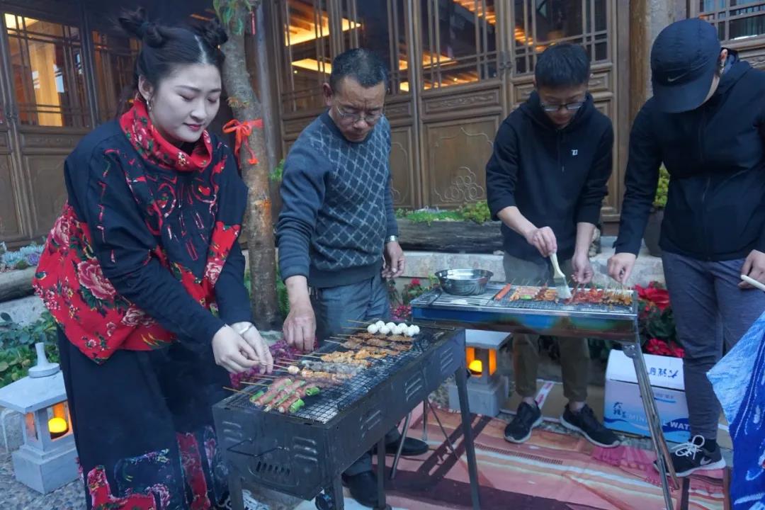 夜幕降臨時,燒烤架架好了,此時庭院的氣氛也歡騰了起來。