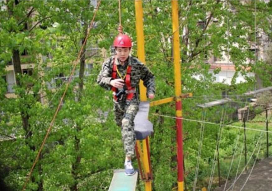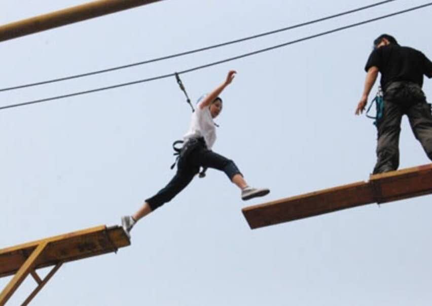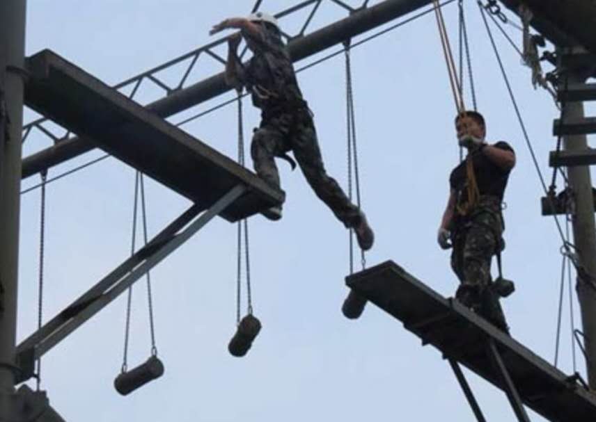 高空斷橋操作流程:學(xué)員站在板上,眼睛注視前方,起步、跨躍、落地。如果有人問你能否一步邁過1.1米的距離,你可能會(huì)覺得有些好笑,那有什么難的?但是,試想一下把這個(gè)距離放到8米高空,你腳下踩的是一塊只有0.3米寬、1米左右長(zhǎng)的鋼板,要跨到另一塊同樣細(xì)長(zhǎng)的鋼板上,兩者之間雖然只有1.1米,你能保證自己心里一點(diǎn)的也不打鼓嗎?高空斷橋就是通過讓你在高空邁過這艱難一步來進(jìn)行心理訓(xùn)練,它能令你勇氣倍增。