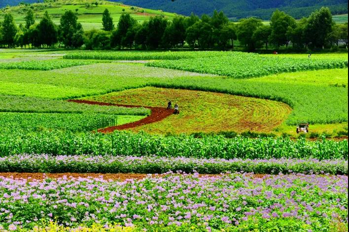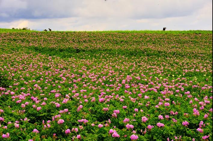 太安的洋芋花分別是:白色、粉色、紫色,3個(gè)不同的色彩,一朵朵的小花,就像一個(gè)情竇初開的少女,羞澀惹人愛。哈哈,雖然你吃過土豆,但是你有見過如此大片三色彩的花海嗎?一行人漫步在色彩斑斕的三色世界,走在花間小道,隨處可見的游客,在田間嬉戲拍照,輕輕撫摸花枝,俯下身細(xì)聞洋芋花粉的獨(dú)特味道,香氣撲鼻。站在小山峰俯瞰整個(gè)的洋芋花海,藍(lán)天白云的天,和五顏六色的花海?;ê吞炜眨瑑煞N鮮明的顏色,搭配在一起,讓眼前的景變成了一張美麗的明信片。